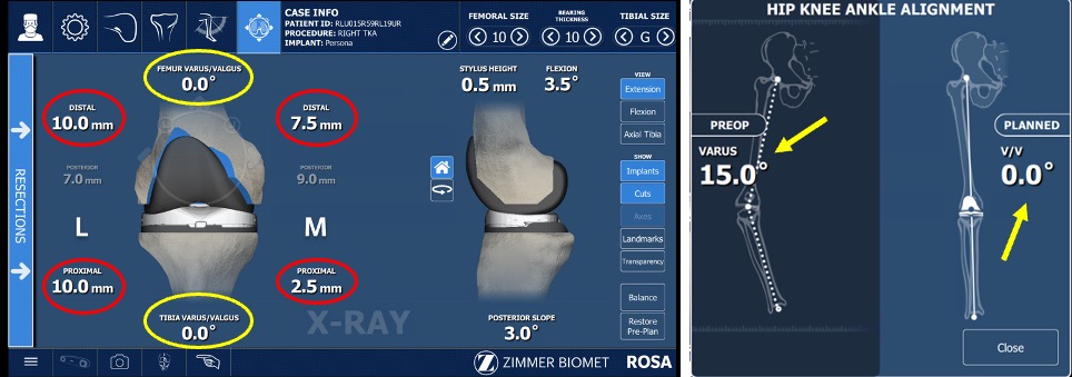 Planejamento cirúrgico utilizando o software. Vemos na imagem da esquerda que conseguimos ajustar o ângulo correto o alinhamento do membro inferior (círculos amarelos). Nos círculos vermelhos, conseguimos quantificar quantos milímetros iremos fazer de ressecção óssea para atingir o resultado desejado.